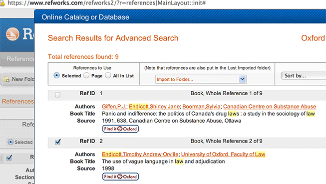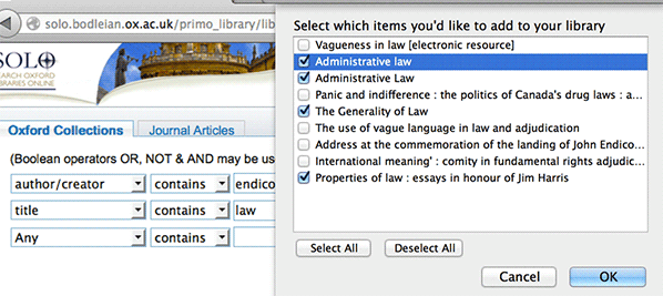 Fig 1. Endnote online search in University of Oxford catalogue for Endicott in the author field and law in the title field: the catalogue is highlighted in the left frame (U Oxford); the search box is in the top central frame; and the results are in the box below. The highlighted results have been selected for deletion.