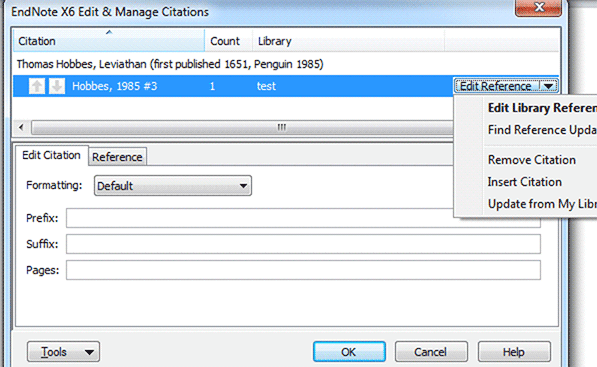 References can be changed in the Endnote library and then updated throughout a document by reformatting the document (using the Format Bibliography function in some versions, and the update function in others). Endnote scans documents frequently for this purpose. This process can devour a lot of computing power, especially in an old or low-powered laptop with a long thesis containing many footnotes. The process can be disabled (in Instant Formatting in the word processor's Endnote toolbar, which is usually with the Format Bibliography functions). Many Endnote users report frequent computer crashes because they don't know the process is active, let alone that it can be switched off. Corruption of the document can occur if Endnote references are deleted from a footnote rather than removed using the 'Edit Citation', 'Remove Citation' function in the word-processor's Endnote toolbar (see Fig 4). This clumsy function sometimes erases all mentions of a particular citation rather than the citation in the specific footnote.