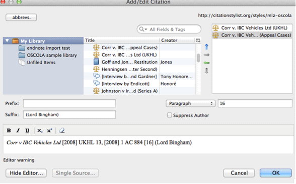 Fig 5. Zotero citation insertion box showing insertion of a case reference with neutral and law report citations, pinpoint to paragraph and attribution to judge (using the suffix field). Changes can be made in the Edit box at the bottom of the screen if required. Any changes made at this stage only apply to that particular footnote.