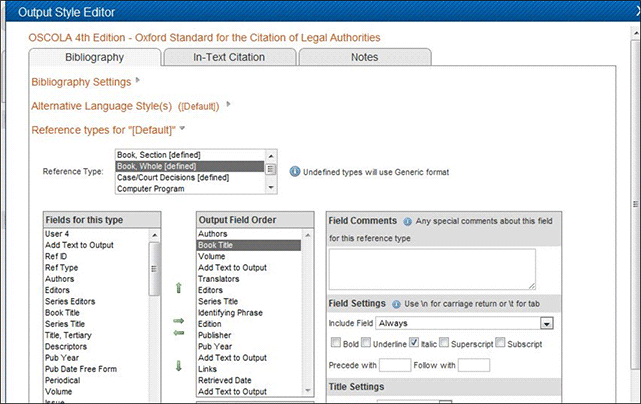 Fig 6. Output style editor in Refworks showing Reference Type, Fields and Output Field Order boxes. Elements are dragged from one box to another and reordered with a drag. Punctuation and fonts are set for each element. The title field is shown as Always Included and in italic in the Book title field for the Book, Whole reference type on the right side of the screenshot.