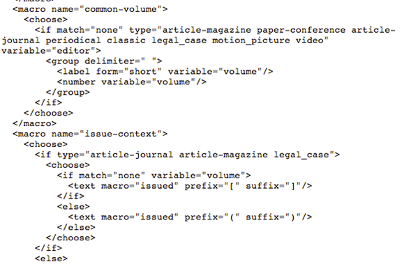 Fig 8. Zotero output style editor showing part of the MLZ OSCOLA style which is written in Citation Style Language, an open XML-based language. A high level of technical skill is required to make alterations to Zotero styles.