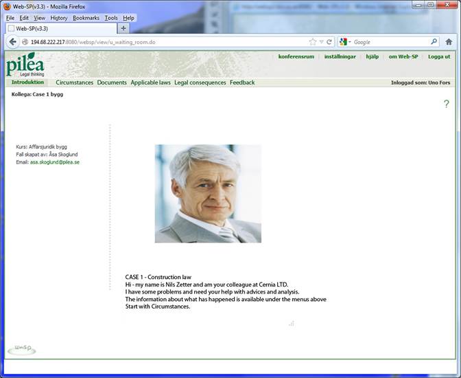 When the adaptation of Web-SP into law had been performed, the case creating process started with training of the law teacher in how to create cases in Web-SP and then to start to develop the first case. All cases were based on real legal cases from The Supreme Court in Sweden but were put in as anonymous copies with some details altered to avoid identification of the real cases.
