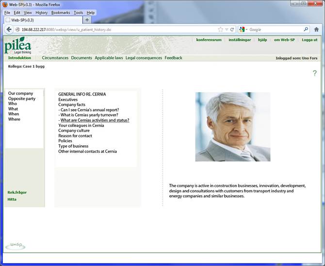 The virtual case used in the study started up with a brief introduction to the case, see Figure 1. Then the learner is supposed to start to investigate the case by for example asking questions to the client or his colleagues. This is done by selecting among the hundreds of available questions from the sub-menus, click on that question, and then in real-time receive a reply in the form of a still image and text (see Figure 2), or by a video clip. The vast amount of available questions means that the user cannot click on everything, and is forced to reflect on which questions that are most important and focus on relevant follow-up questions etc. The users may also order any of several legal and other documents (see Figure 3) and in the end, propose a decision and justification of that.