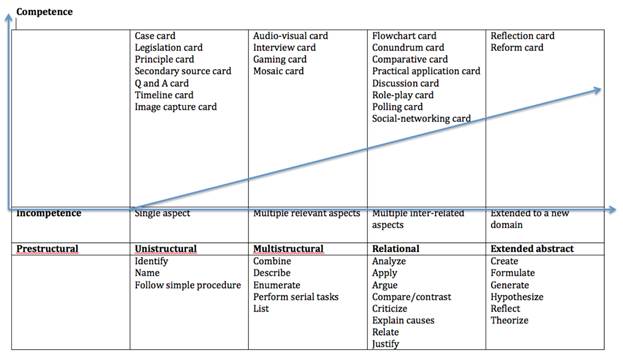 Each type of flashcard described in our taxonomy has different characteristics helping to align them to the Biggs and Tang model. For example case, legislation, principle, secondary source and Q & A flashcards focus on a single aspect of a case or legislation and in that light are unistructural. The limited size of each flashcard promotes a concise analysis of the issue discussed. This chunking of information assists with memory acquisition and retention. A unistructural approach is also involved with the simple procedure of a timeline card and an image card that captures and names a single aspect of knowledge. If any of these cards consider multiple relevant aspects then they transition into a multistructural phase.