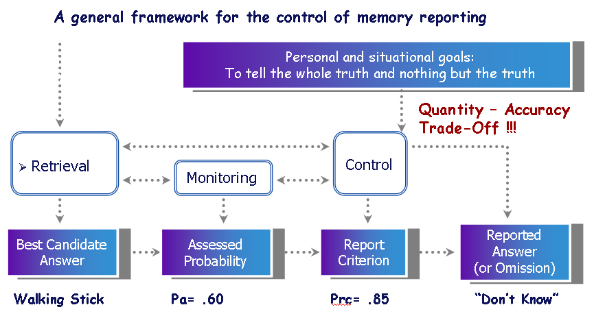 By this model, when attempting to answer a question from memory, witnesses do not simply spew out all of the information that comes to mind. Rather, once an item of information is retrieved or reconstructed from memory, a monitoring process is used to evaluate the probability that the information is correct, that this assessed probability is then compared with the report criterion that has been set in a particular reporting context: The information will be reported if its assessed probability passes the criterion; otherwise it will be withheld (responding "don't know). [18] A higher (stricter) report criterion will be set in contexts emphasizing accurate reporting (e.g., courtroom testimony), whereas a lower (more liberal) criterion will be set in contexts emphasizing the quantity of information (e.g., initial stages of an investigation; informal social interaction). To the extent that the monitoring process is effective, the use of a higher report criteria will in fact increase the accuracy of the information that is reported. However, because the monitoring process is not perfect, some incorrect information will nevertheless be reported, and some correct information will be mistakenly withheld. Thus, the general pattern is a quantity-accuracy trade-off: By utilizing one's metacognitive monitoring and control processes, memory accuracy can be increased, but this generally comes at a cost in the amount of information that is reported. .