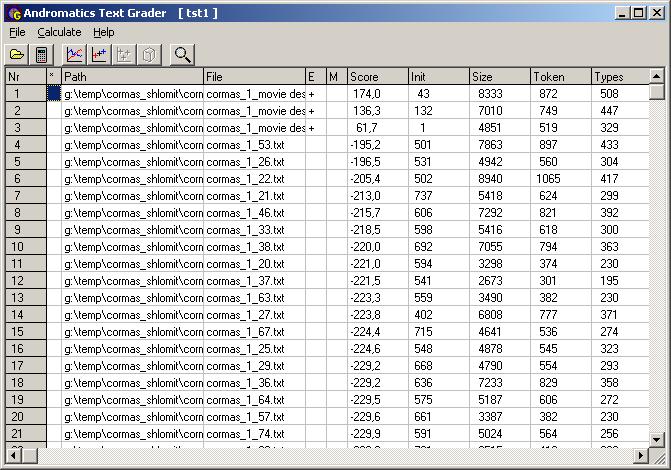 The technique which is used in the programme for comparing reports and putting them in order is described in Combrink-Kuiters, De Mulder, Elffers & Van Noortwijk 1999. A central role in this process is played by the word usage in the documents. Other linguistic aspects, for example word frequency in the document, position of the word in the document, interaction effects between (pairs of) words and particularly syntactical analysis, are not used in this system. In the initial stage, the program reads the reports and produces a data matrix. In this matrix, each word type (i.e. each different word) that is found while examining all the documents is placed in a row and each document has a column. An indication is then given for each word type of the documents in which it was found.