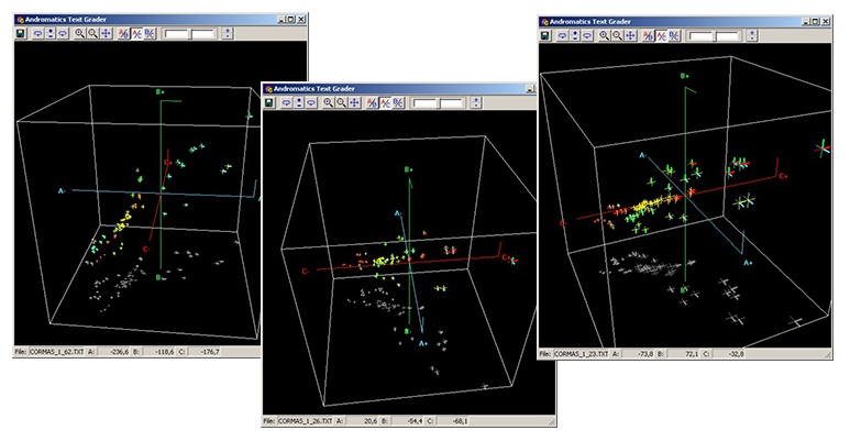 The program can also produce a scatter graph of the data for these three separate measures. These are three-dimensional graphs of quantity-based, accuracy-based, and gist-based criteria. These graphs show how the measures correlate with one another (see Figure 4).