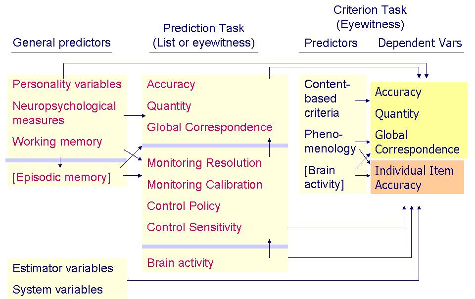 The idea behind this scheme is that various measures of individual differences in personality, neurospsychological functioning, memory and metamemory functioning can be used to predict the general ability or tendency of a person (witness) to provide complete and accurate memory reports. These measures can be derived using parts of standard test batteries as well as using new measurement techniques (e.g., the QAP methodology described earlier) developed in the other strands of this project. These individual-difference measures, together with measures of selected system or estimator variables (e.g., the amount of time that has passed since the witnessed event, the age of the witness, the type of questioning technique, and so forth) can be used to predict the overall quality of a memory report produced by a particular witness under specific conditions. At the same time, indices tied to individual answers or specific statements made by the witness (e.g., confidence or "vividness" ratings elicited from the witness) can be added to the more global individual and situational variables to allow prediction of the accuracy or inaccuracy of these specific statements. Thus, the assessment scheme is both multi-componential and hierarchical, including predictive variables that relate to qualities of the witness, to aspects of the overall memory context, and to specific pieces of information provided by the witness in that context.