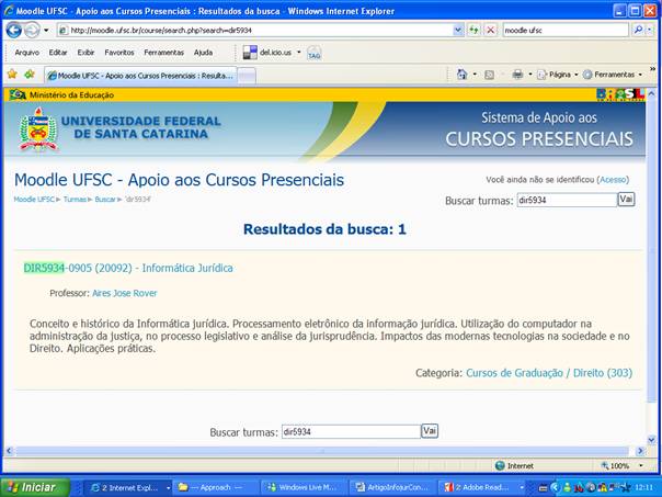 Law and Informatics (DIR 5934) was the first discipline of Law Course of UFSC to agree the recently corporate platform of UFSC's Moodle in the first half of 2009, which can be seen in Figure 1. How this has worked a positive effect among students and sparked interest from other teachers of the center, two more courses were available in the second half of 2009 by other teachers.