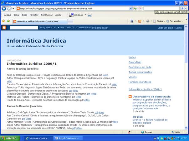 The blog [18] of the discipline Law and Informatics was initially created as a communication tool among the monitors students from the Law and Informatics Laboratory (Linjur) at UFSC. They post their daily activities and made links to articles and power point presentations, contained in the repository Buscalegis [19]. The suggestion to the teacher to use this blog for the discipline activities was from the monitors [20], who were already students of the discipline and had not previously used the blog. Thus, the monitors had na understanding that other colleagues could also share this experience. The monitors have the mission of support to other students for the use of the informatics resources of the Linjur Lab.