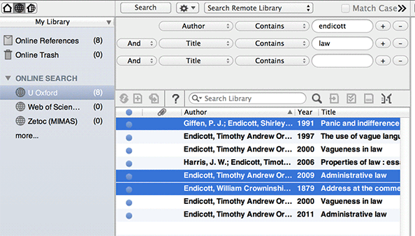 Fig 1. Endnote online search in University of Oxford catalogue for Endicott in the author field and law in the title field: the catalogue is highlighted in the left frame (U Oxford); the search box is in the top central frame; and the results are in the box below. The highlighted results have been selected for deletion.