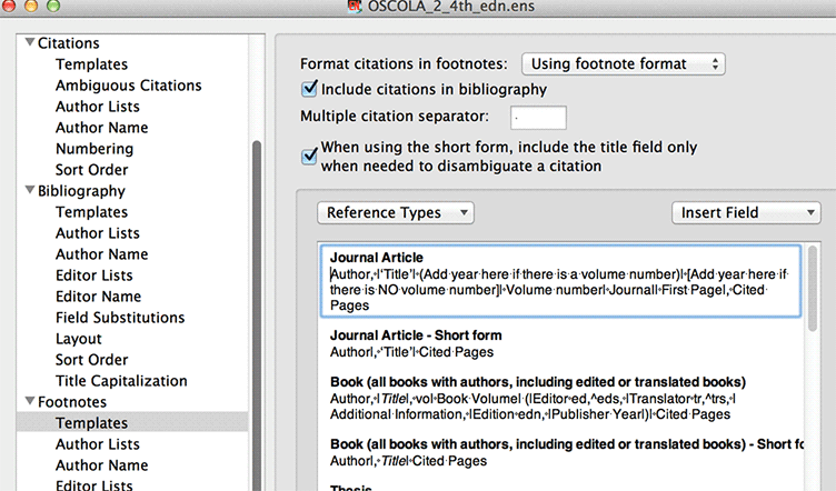 Fig 7. Endnote output style editor showing footnote templates and tick box for including a bibliography in the document (top middle). In the journal article template, the format provides the author first, followed by a comma, then the article title in single quotes, followed by the year in either parentheses or square brackets depending on how the particular journal is referenced, and so on.